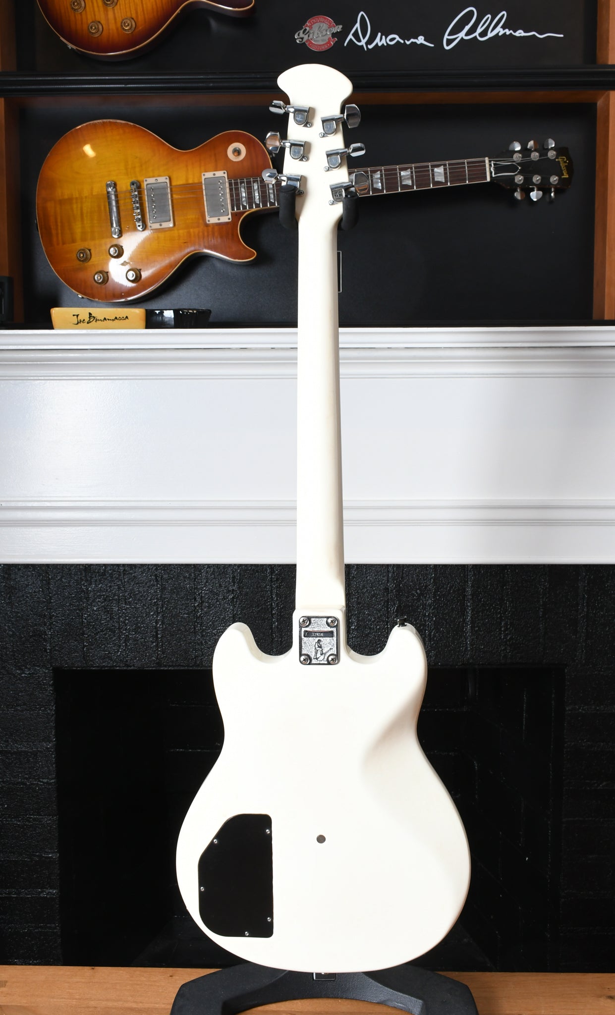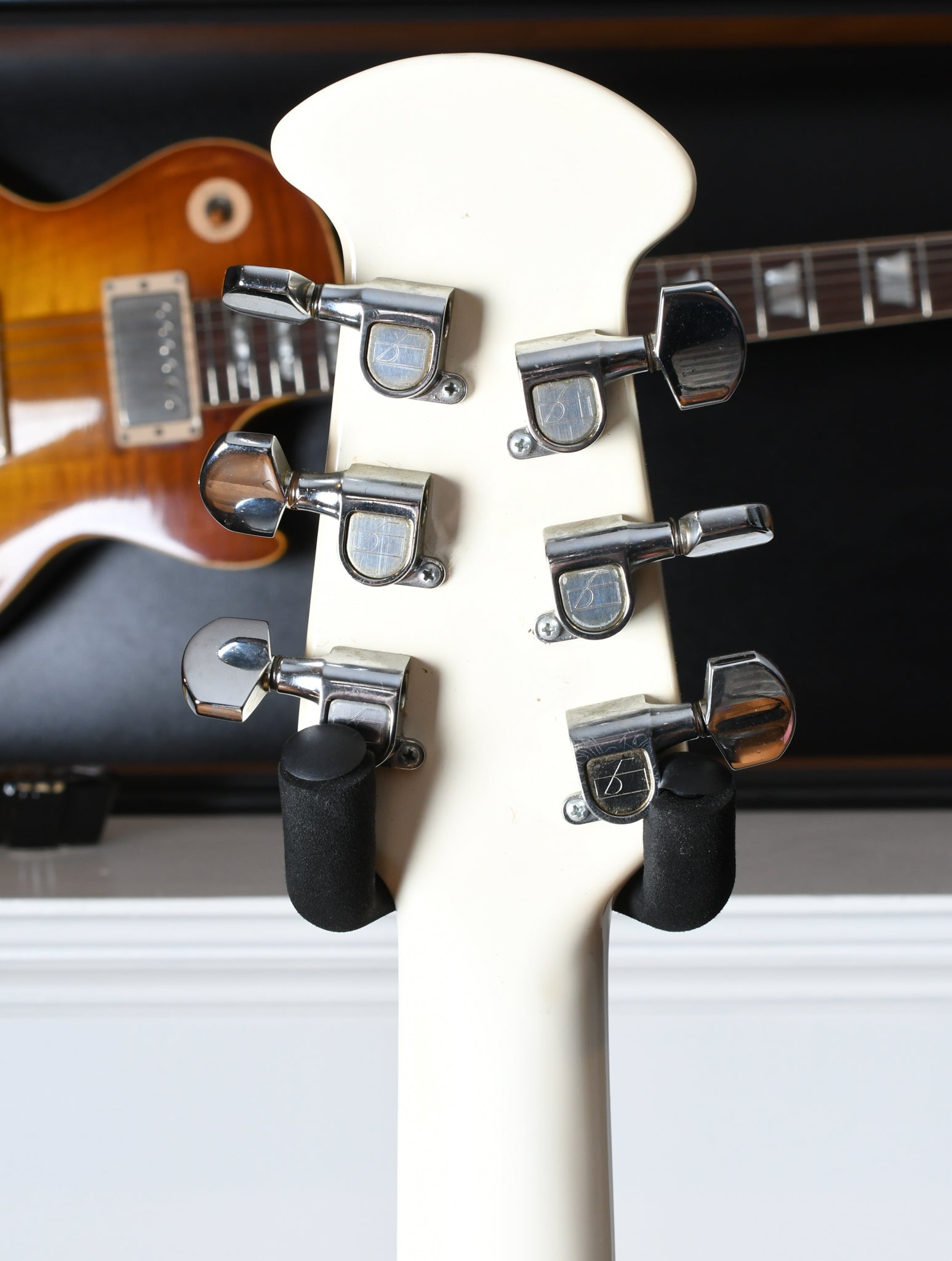 Here's a fairly rare Ovation Preacher electric guitar finished in white. These are hard to date but the Preacher logo on the Pickguard and the serial number should put us around 1979. This guitar is all original and the pickups have a really warm and sweet tone to them. Ships in the OHSC.