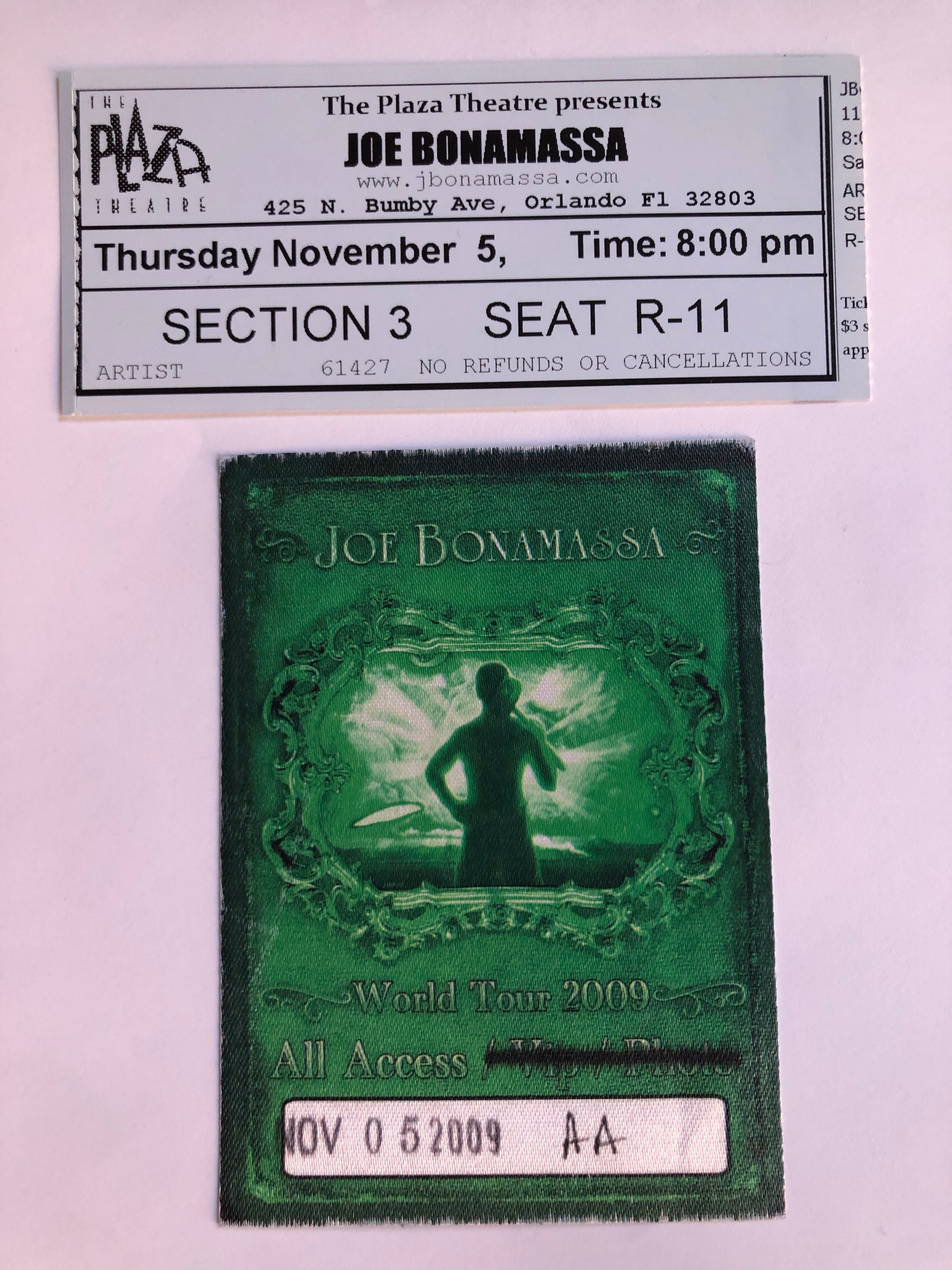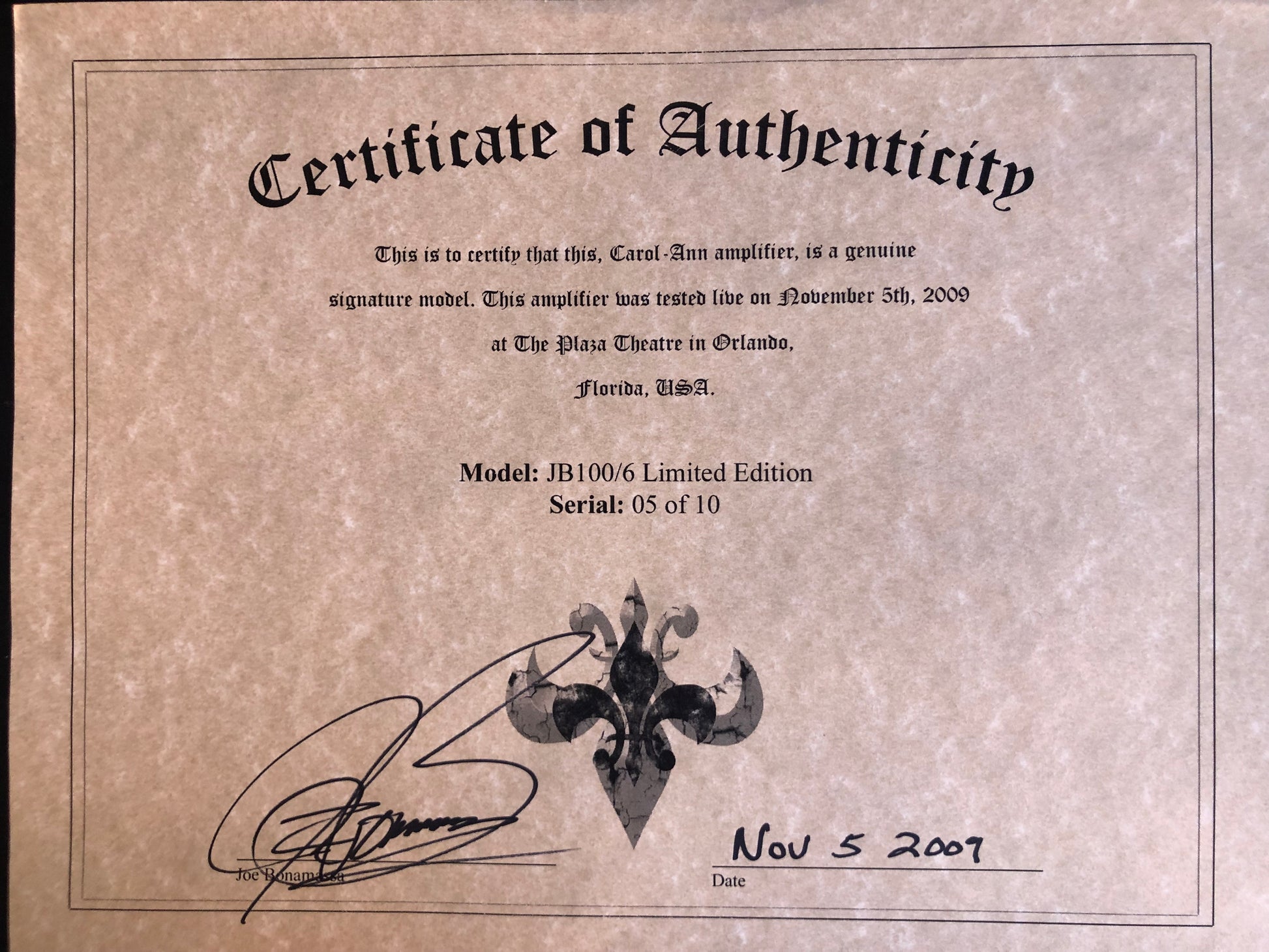 In our pursuit to find unique Les Paul's here's a really nice example of a Bonamassa aged '57 Goldtop. This guitar was purchased by my client and I arranged for him to meet with Joe when he picked up his Bonamassa Carol Ann JB-100. We brought both this guitar and the JB-100 to the venue and Joe was a great host for over an hour with us. During that time he ran through his stage rig and pedal board with us as well as played and signed both the amp and guitar for us. It was a great time and we all enjoyed the show Joe put on after meeting us. Watchtower Guitars is now offering both this signed '57 Goltop and the Carol Ann Bonamassa JB-100 #5 for sale. Included are images of this guitar and the JB-100 on stage with Joe. This is a real treat for you Joe fans out there. Enjoy!
