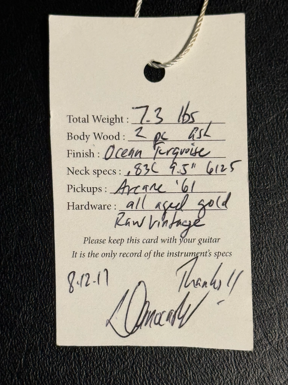 2017 Danocaster Double Cut in Ocean Turquoise fitted with Arcane 61 single-coil pickups. Built as a vintage-inspired bolt-on by Dan Strain’s workshop, this double-cut example features a comfortable .83C neck carve that many players find fast and familiar. The guitar is finished in Ocean Turquoise, weighs 7.3 lb, and ships in a gig bag with the original hangtag. Danocaster's are known for attention to period-correct details and playability.
