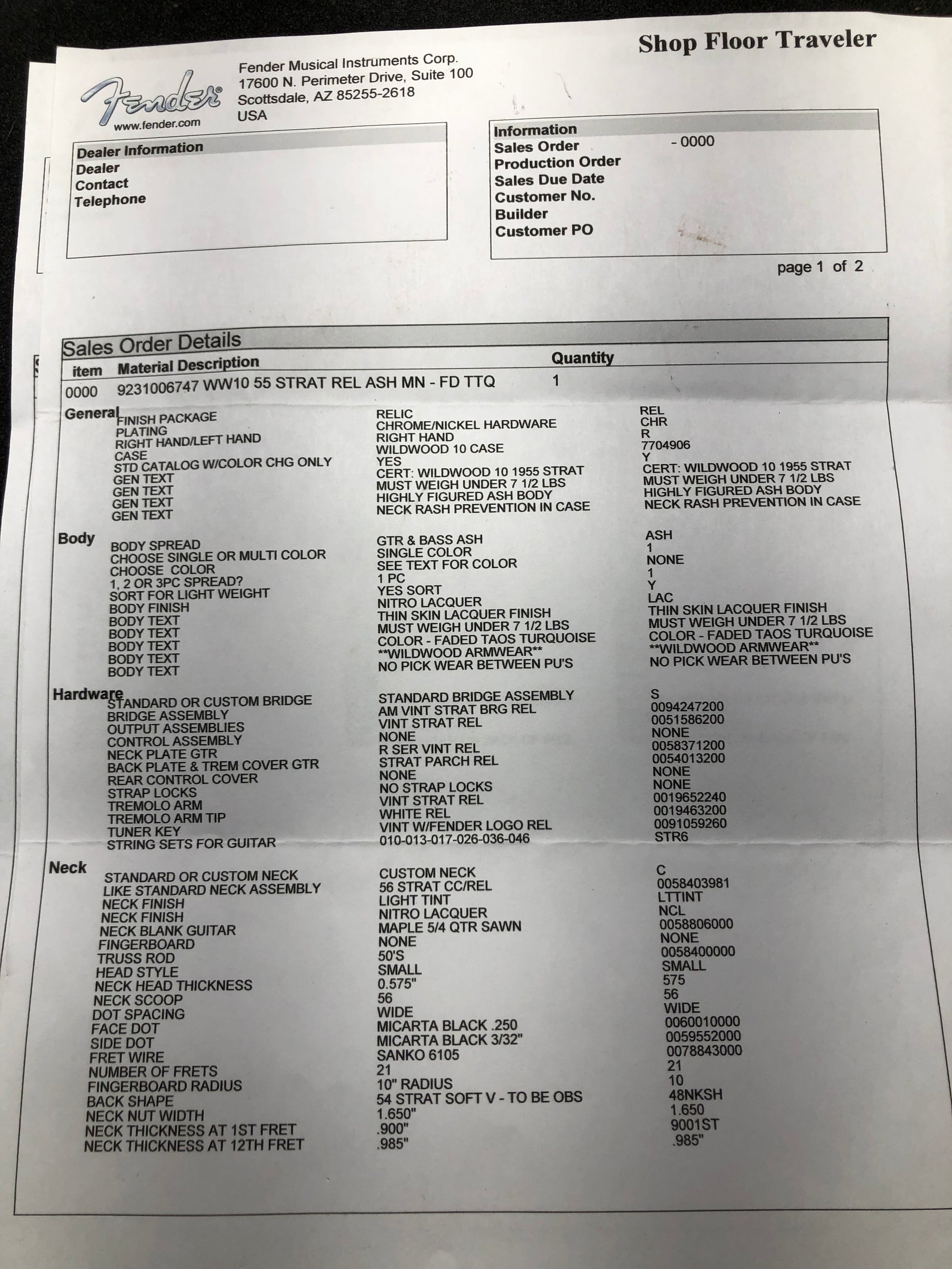 This is a really special sounding Custom Shop Stratocaster. When the Fender custom shop and Wildwood came up with the specs for these Wildwood 10's they really came up with a winner here. The relic is also just right and not overdone it's really tasteful. Everyone who picks this guitar up comments about how cool the neck looks and feels. She ships in the original case with case candy package and Custom Shop COA. The Fender Shop Traveller sheet is pictured with all of the specs. Please let us know if you have any questions.