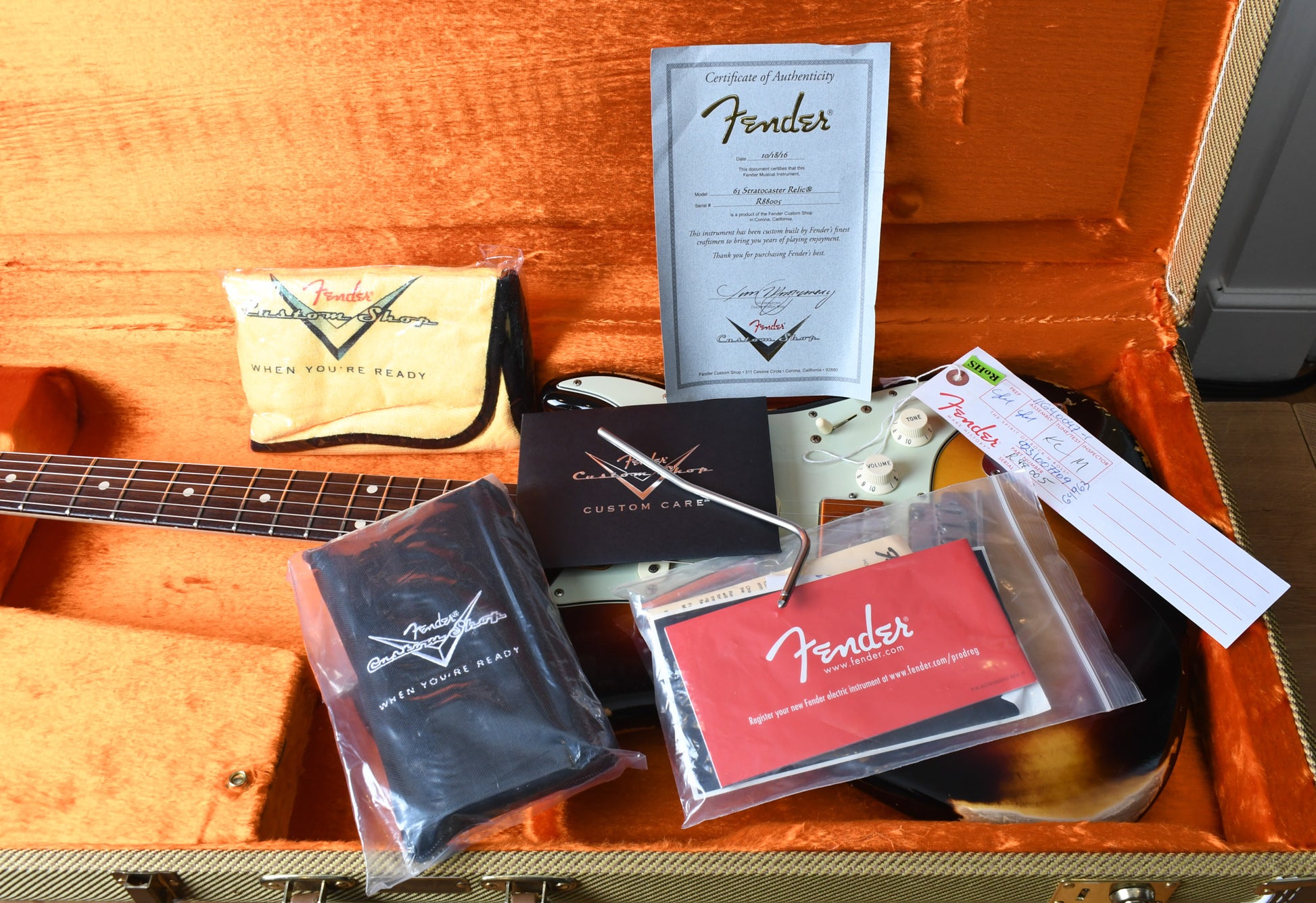 This is a really unique custom ordered '63 Custom Shop Stratocaster loaded with an HSS setup and a 2 point Fender tremolo. It's got a very comfortable feel on the neck and it has that perfect well worn feel of a sixty year old Strat. It has that soft C shape that we all love. The relic work is also just right and not overdone it just has that played in vibe. Everyone who picks this guitar up comments about how cool the neck looks and feels. Once you plug it in the guitar just delivers those authentic 50's Stratocaster tones but then you can really rip with the humbucker in the bridge. She ships in the original tweed case with case candy package and Custom Shop COA shown. Please let us know if you have any questions.