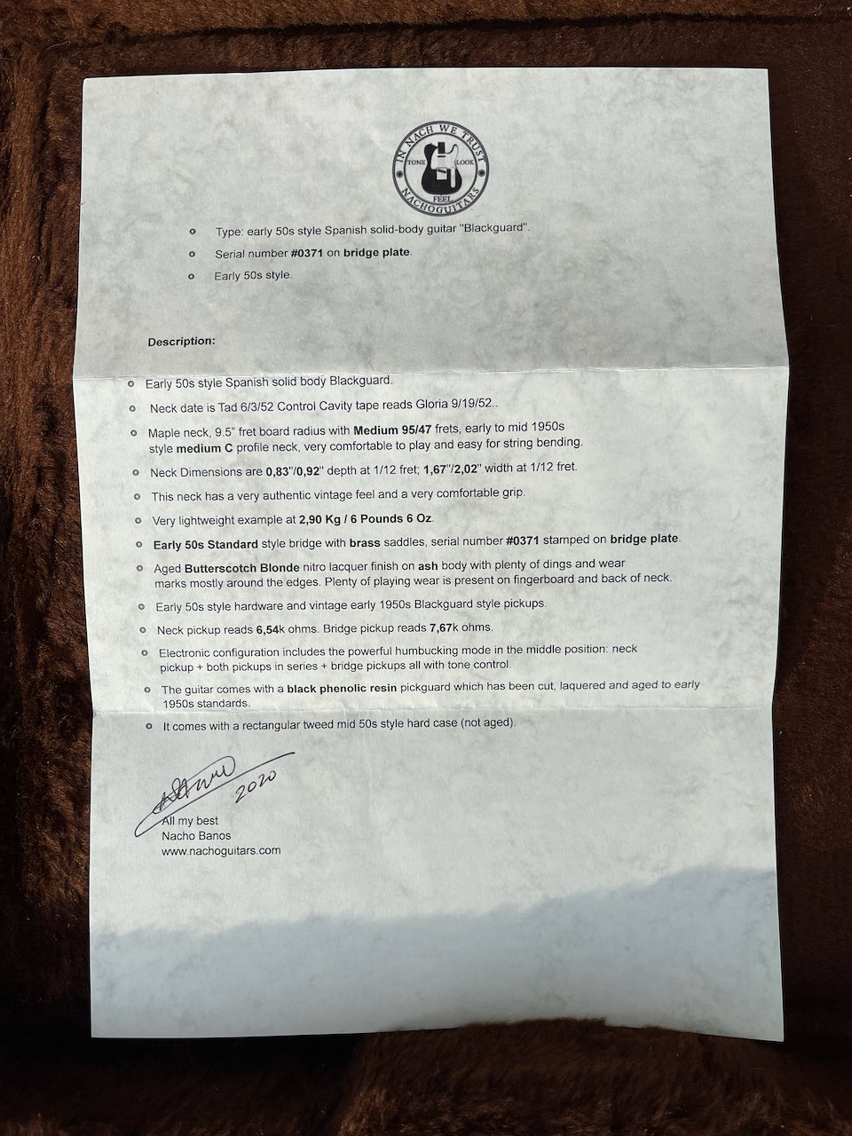 Not only is Nacho Banos a recognized (and published) authority of early vintage Fender style guitars, and an absolute master builder with an amazing eye and skill for aging them - he is genuinely one of the nicest and most intelligent people in the guitar industry.