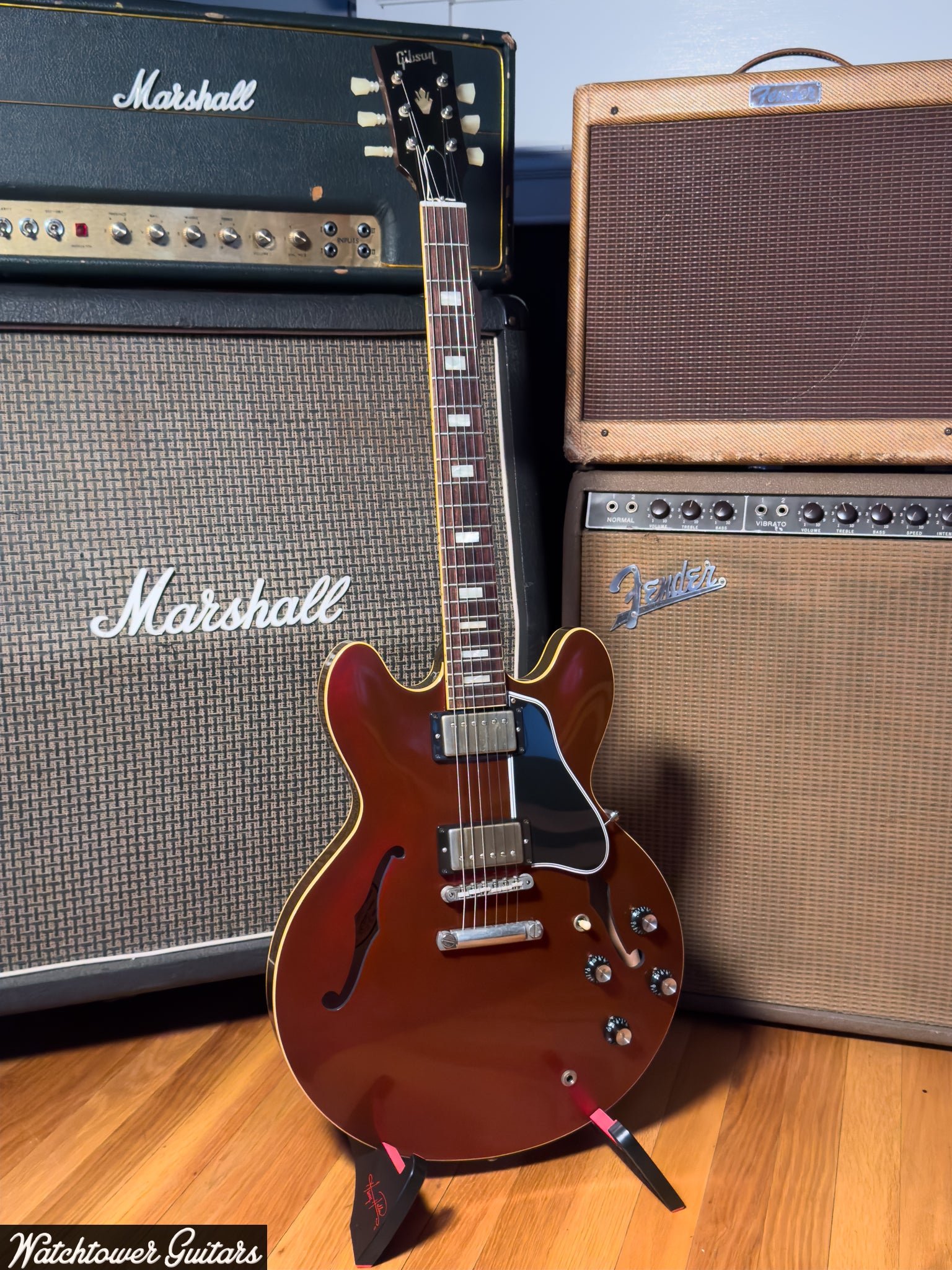 This ES-335 was constructed with a laminated maple body and a mahogany neck with a rosewood fingerboard. The neck measures 1 11/16” at the nut, has a depth of 0.81” at the first fret, and a depth of 1.00” at the twelfth fret. The guitar has a 24 3/4” scale and weighs 7lb 12oz.