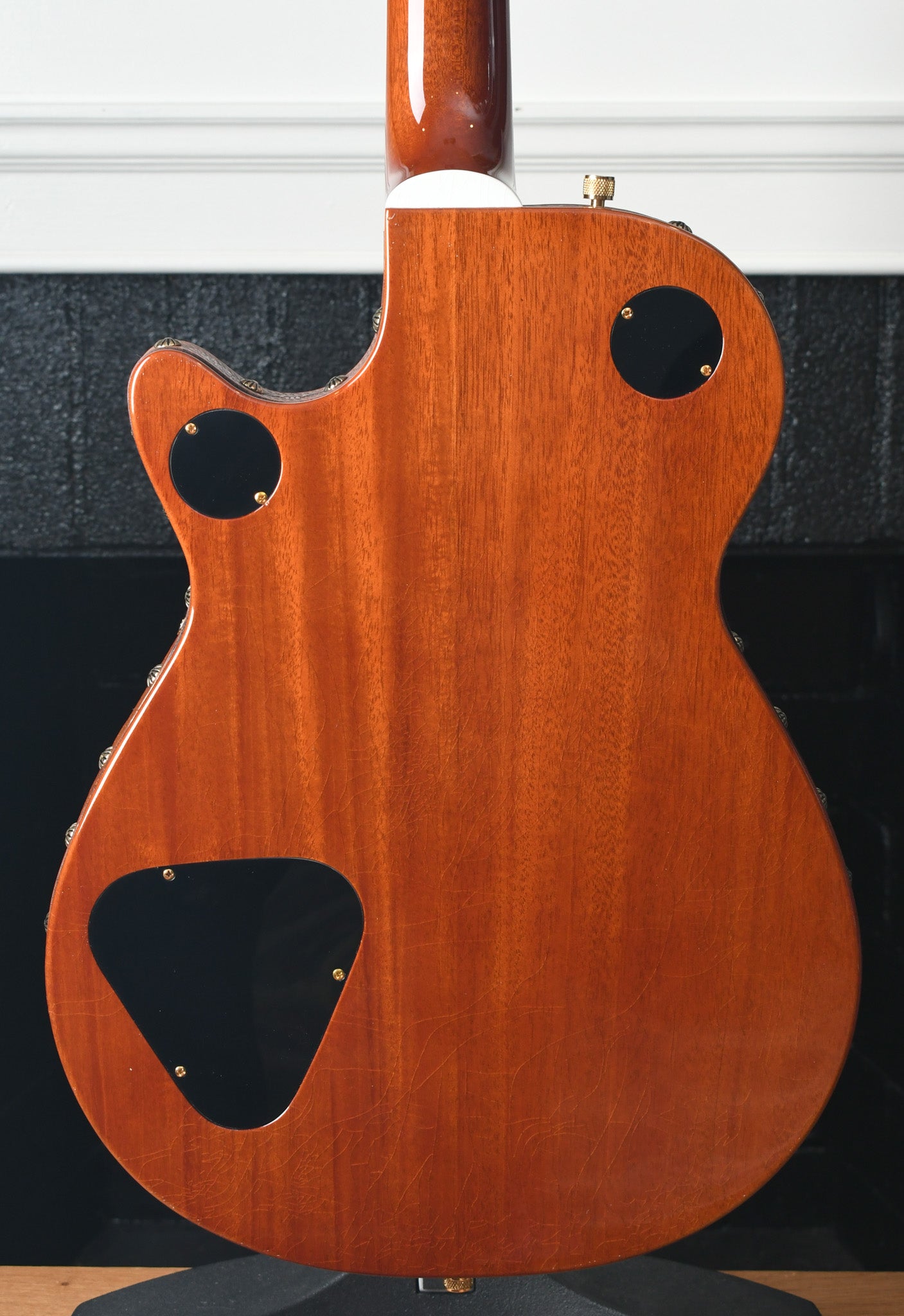 This beautiful 2021 Gretsch Masterbuilt Steven Stern G6130 '55 Roundup with knotty pine top is finished in a walnut stain. This is a light relic with light checking in a “closet classic” style, as opposed to NOS.