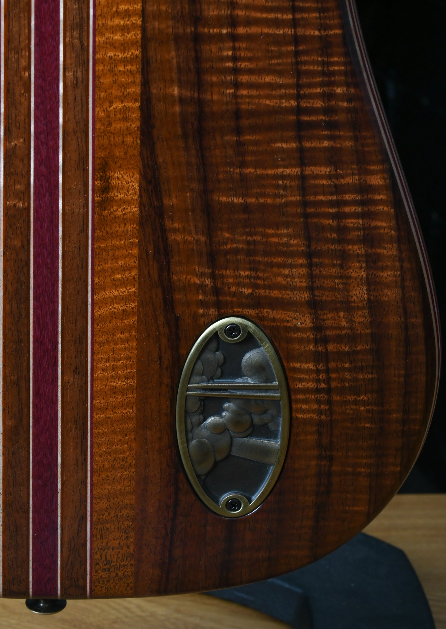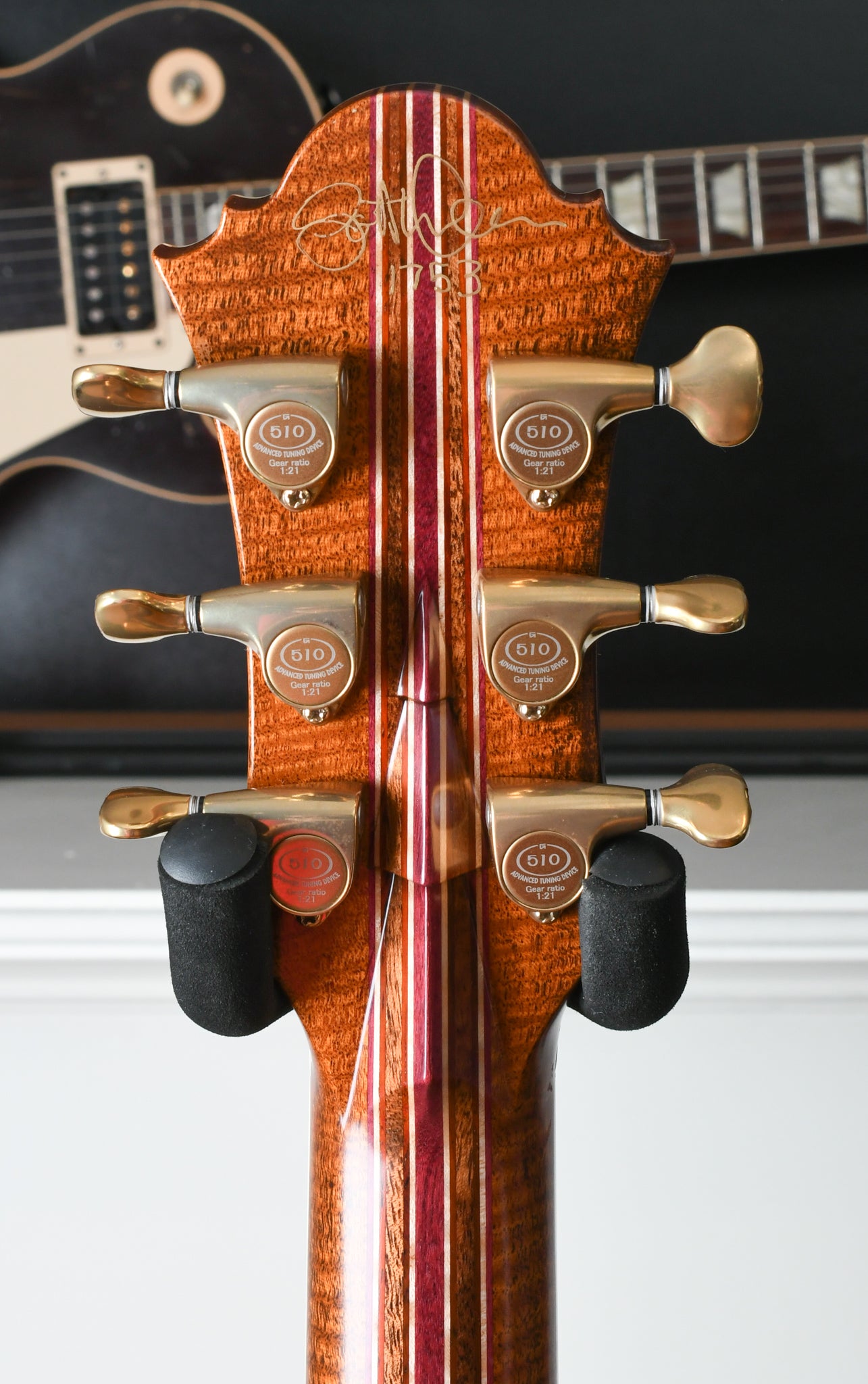 One of Scotts own added feature is the tapered neck laminates. This aligns the main portion of the neck (maple in the one pictured) to be straight and have continuous grain down the whole length of the neck. The tapered laminates are a modern construction technique and gives the instrument a more refined aesthetic.