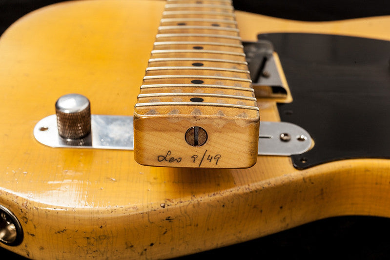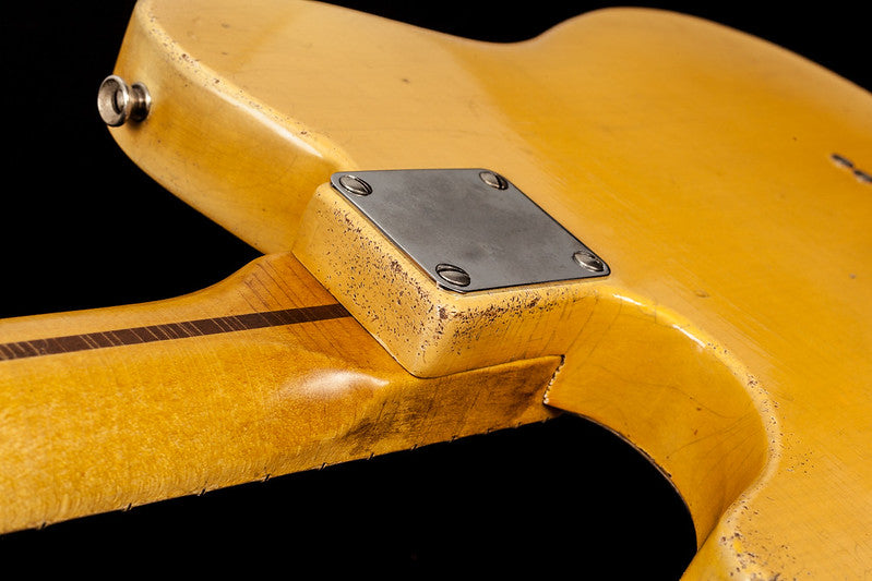 * Aged Early 50s Blonde Butterscotch nitro lacquer finish on thinner 1.5" ash solid body with plenty of weather checking. The finish on this guitar has been cured and aged for months,