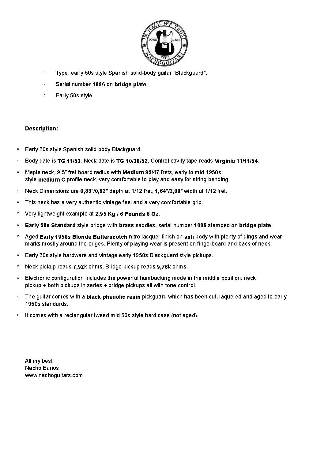 Not only is Nacho Banos a recognized (and published) authority of early vintage Fender style guitars, and an absolute master builder with an amazing eye and skill for aging them - he is genuinely one of the nicest and most intelligent people in the guitar industry.