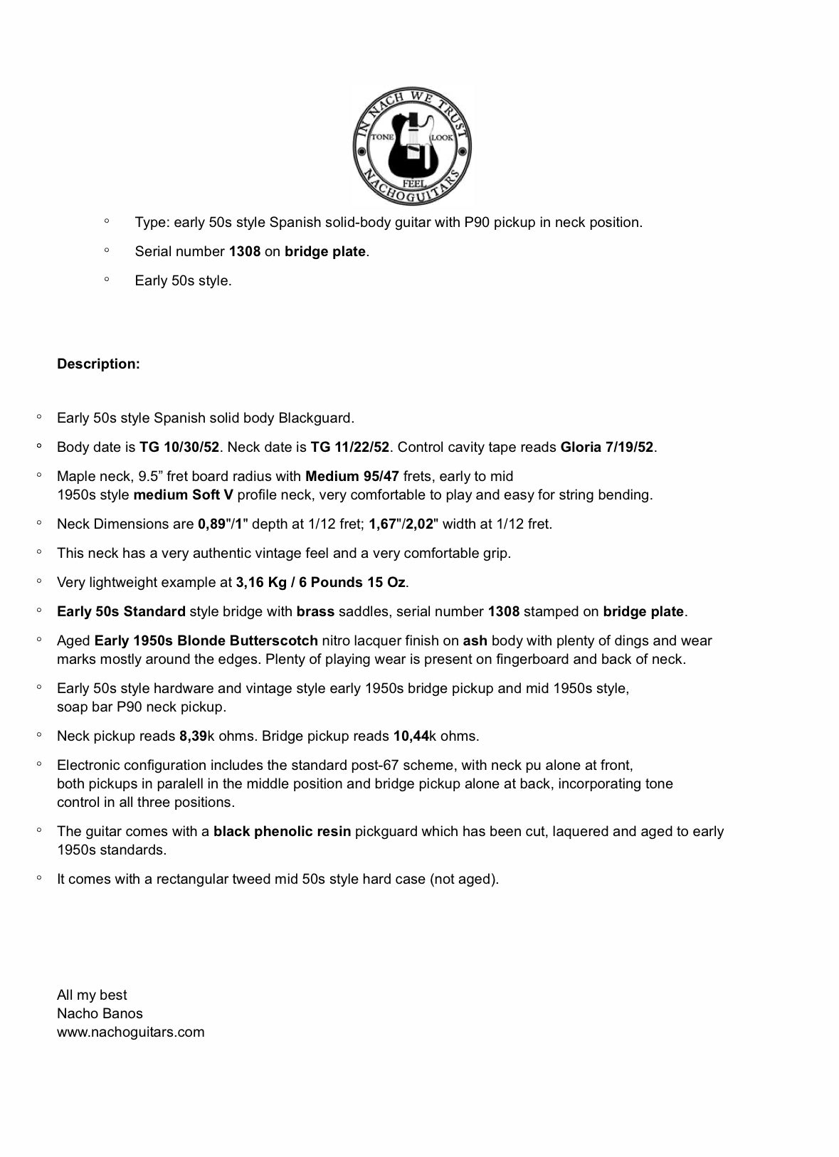 Not only is Nacho Banos a recognized (and published) authority of early vintage Fender style guitars, and an absolute master builder with an amazing eye and skill for aging them - he is genuinely one of the nicest and most intelligent people in the guitar industry.