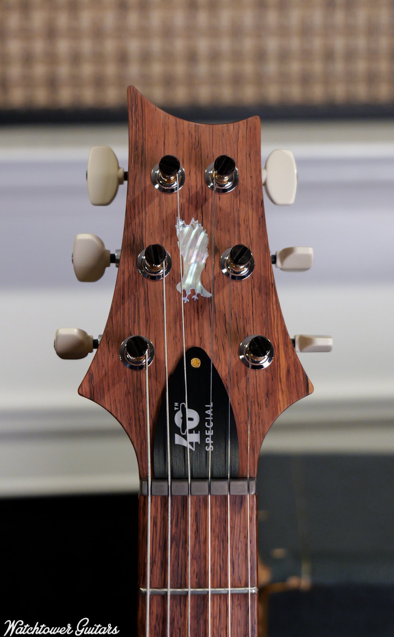 Playability and hardware reflect PRS tradition and modern reliability: 25" scale length, 22 frets on a 10" radius fretboard, and the Pattern neck profile for comfortable fretting. Visual nods to the brand’s history include PRS “Old School” birds with outlines and a PRS “Pre‑Factory” eagle headstock graphic. Performance hardware comprises the PRS Gen III patented tremolo, PRS Phase III locking tuners with wing buttons, and PRS Signature 10–46 strings. Each guitar ships with a hand‑signed 40th Anniversary certificate and is one of only 280 made.
