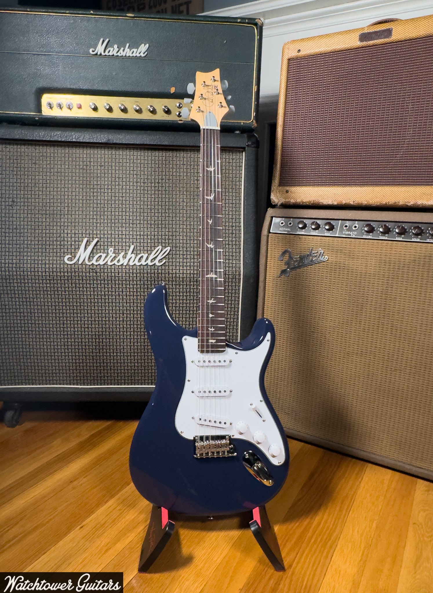 The PRS SE Silver Sky Rosewood in Trad Blue is a refined version of the original Silver Sky model, collaboratively designed with John Mayer in 2018. This instrument melds classic aesthetics with modern playability, making it a versatile choice for guitarists. The Trad Blue finish lends a sleek and sophisticated appearance to its poplar body. Featuring a bolt-on maple neck and rosewood fretboard adorned with PRS's iconic bird inlays, this guitar combines visual appeal with a smooth playing experience.