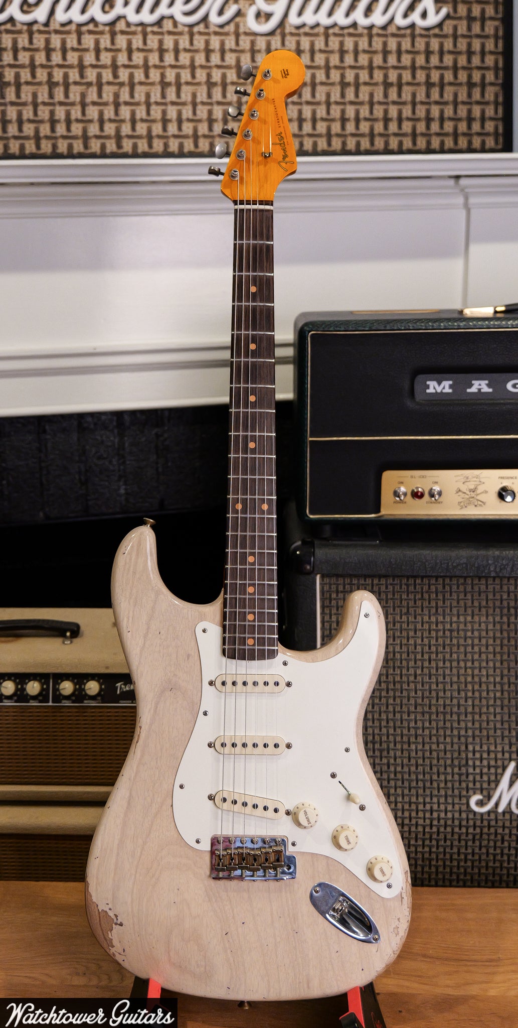 This 2023 Fender Limited Custom Shop Troposphere Stratocaster in Aged White Blonde Relic finish offers a vintage-inspired aesthetic combined with modern playability. This Stratocaster features a carefully aged white blonde finish that gives it a well-worn, classic look, reminiscent of vintage guitars. Weighing in at 7 pounds and 4 ounces, it maintains a comfortable balance for extended playing sessions. The guitar comes with an original hardshell case (OHSC) and includes all case candy along with a certificate of authenticity (COA), ensuring its status as a limited edition collectible piece.  Hand wound Josefina Troposhere pickups.